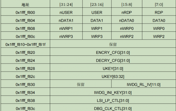 注意1:编程时,反码由硬件自动实现,软件写无效。选项字节的组织结构如下表所示。选项字节可以从下表列出的存储器地址读出,或从选项字节寄存器 (FLASH_OBR) 读出。