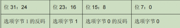 选项字节由用户根据应用配置(例如:可以选择使用硬件看门狗或软件看门狗)。对于0x1FFF F800~0x1FFFF810地址的选项字,在选项字节中每个32位的字被划分为下述格式: