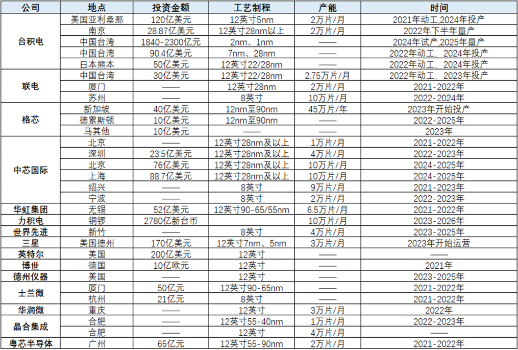 从上表可以看出,晶圆代工龙头台积电先后启动了在美国亚利桑那州、中国南京、中国台湾高雄等地的建厂和扩产计划。今年的资本支出预计超过400亿美元,三年内支出更是高达1000亿美元。其中,南京工厂方面,台积电表示将投资28.87亿美元扩增28nm产能,在2023年实现28nm芯片月产能4万片;此外,台积电还计划在日本九州熊本市兴建12英寸晶圆厂,聚焦22纳米及28纳米制程,产能约达到4.5万片,初期预估资本支出约70亿美元;同时台积电还宣布将于高雄设立生产7纳米及28 纳米制程的晶圆厂,预计于2022年开始动工,并于2024年开始量产。