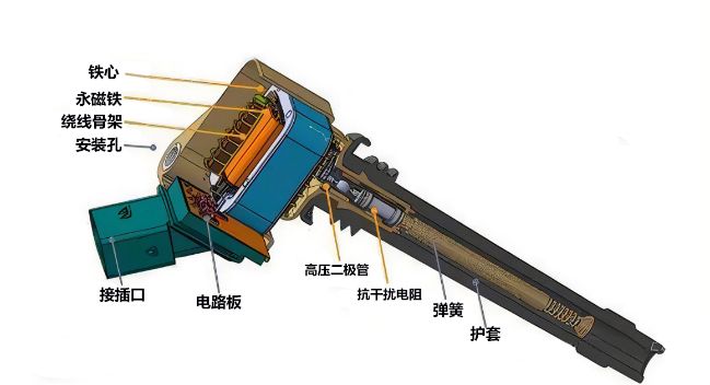 早期汽车点火器中线圈的初级绕组是由机械开关控制,通常也称为断电器触点。断电器触点式点火系统较为简单,成本低,但易磨损。伴随着半导体行业高压大电流功率开关器件的发展,易磨损的传统机械开关已经被更可靠的大功率半导体器件所替代。目前汽车点火器主要采用“插接式”线圈,消除高压接线,并集成绝缘栅双极型晶体管(IGBT)器件及其驱动电路,使汽车点火系统更加紧凑和简单。如图1所示,目前汽车点火器主要由电路板、点火线圈、高压二极管、弹簧、护套、抗干扰电阻以及接插口等组件构成。