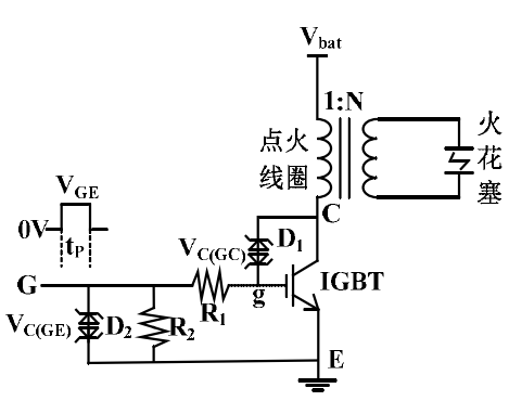 在栅极驱动脉冲触发前,栅极电压VGE=0V,IGBT器件处于阻断状态,集电极电压VCE=Vbat,电感中没有存储能量。