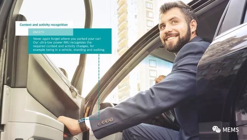超低功耗BMI270可以识别背景环境和活动变化,例如站立、步行或是处于汽车中。因此,当用户停好车打开车门下车时,BMI270可以识别用户完成“停车”动作,并将信息传送至主系统处理器,唤醒定位系统标记当前位置。避免了停车场尴尬,用户再也不会忘记车停在哪里!