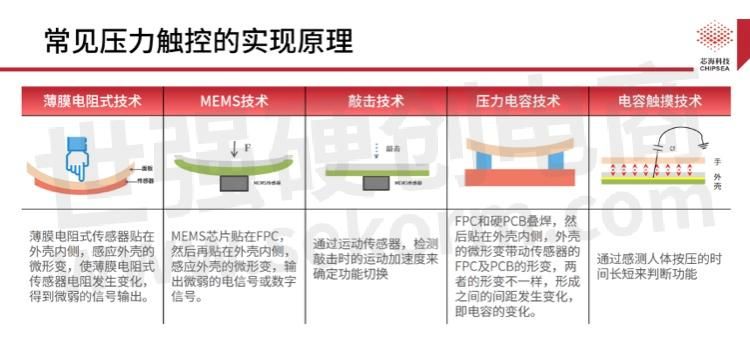 常见压力触控主要有五种技术:薄膜电阻式技术、MEMS技术、敲击技术、压力电容技术、电容触摸技术。薄膜电阻式技术的生产工艺成熟简单、线性压力输出、对制程的要求低,但成本较高,是目前业内品牌厂商普遍运用的技术。MEMS技术相比薄膜电阻式方案的成本低,但生产安装较麻烦。压力电容技术结构简单、成本低,但电容变化小,按偏可能会造成失效,影响用户体验。电容触摸技术成本便宜,但通过按压时间长短来判断功能,体验差。