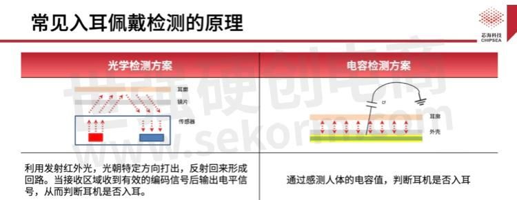 目前市面上常见的入耳检测方式有两种:光学检测及电容检测。光学检测主要利用发射红外光,红外光接触到耳道内壁后反射回来形成回路,以此判断耳机是否入耳。电容检测则是通过感测人体的电容值,通过是否达到阈值判断耳机是否佩戴成功。光学检测不受温度变化影响,相较电容方案测量精度更高,功能更稳定,但体积大、对防水及位置等生产组装工艺的要求高、功耗高、成本高。电容检测方案安装简单,防水以及外观不受影响、功耗比光学低一半左右、成本低,但检测受环境温度变化影响大,出汗及接触到水时容易引起误判。