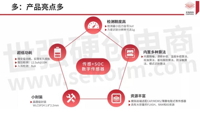 “多”指的是产品亮点多,拥有超低功耗、检测精度高、内置多种算法、资源丰富、小封装五大核心亮点。超低功耗,按压检测:12.5uA@10H,入耳检测:8uA;检测最小压力信号3uV,力度识别分辨率可达1g;内置经过大批量检验的算法(降噪、漂移补偿、温度补偿算法、校准算法、基线跟踪算法、防误触等算法);模拟前端适配CAP/MEMS/薄膜电阻式等传各类感器,具有大容量的FLASH、RAM和IO资源,适配各多场景;TWS耳机体积小、重量轻,采用晶圆级封装,在业内形成性价比优势。