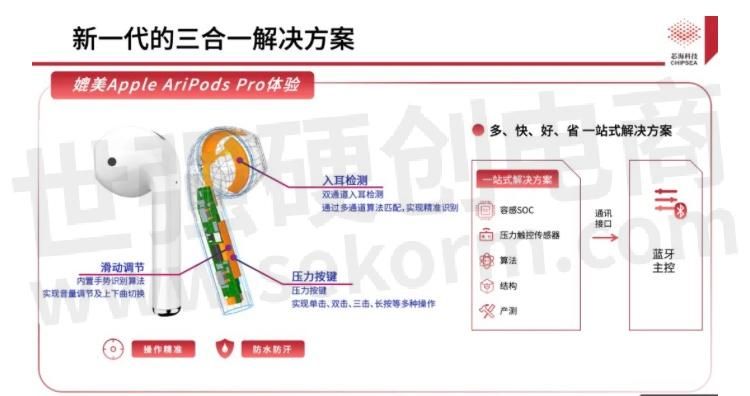 芯海科技新推出的CSA37F72,可以单芯片实现入耳检测、滑动调节、压力按键功能。通过差分测量以及基线跟踪等算法,可以不受温度变化、水、汗的影响,精准识别入耳佩戴检测;通过内置手势识别算法实现音量调节及上下曲切换;支持常用的薄膜电阻式、CAP、MEMS等多种压力传感器,实现单击、双击、三击、按压等多种操作,达到媲美Apple AriPods Pro的体验。