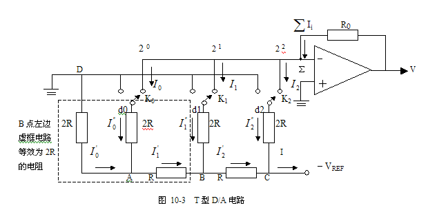 当D= d2d1d0=111时,所有开关Ki均接放大器求和点∑,由于∑是虚地点,从A点看,D点与∑点均为地,所以: