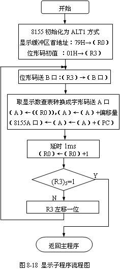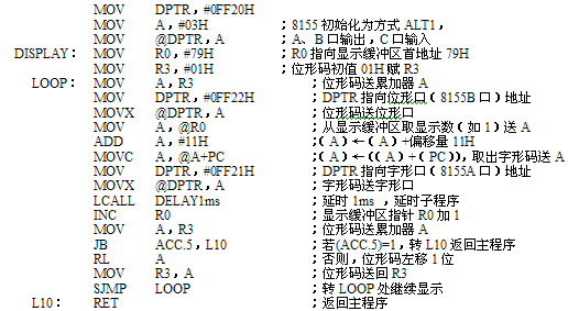 将要显示的6个数存放在显示缓冲区79H~7EH单元中,将0~F这16个数的字形码存放在首地址为CODE的程序存储区。从显示缓冲区取出要显示数送入累加器A,通过变址寻址指令MOVC A,@A+PC将显示数转换成对应的字形码。再将字形码由A送入字形口PA,位形码送入位选口PB,即可显示缓冲区中对应的数字。采用动态扫描法,则可将79H~7EH中6个数在6个八段管DG0~DG5上显示出来。