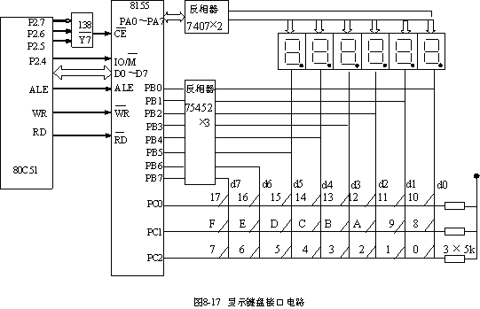 80C51系统单片机的显示键盘接口电路是多种多样,常用的显示键盘接口芯片是8155。现介绍8155作为显示键盘接口的电路,如图8-17所示。