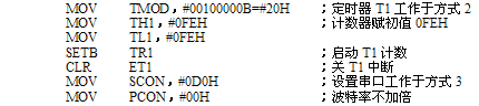 例 在双机通信中,设置串行口工作于方式3,波特率为9600,定时器T1工作于方式2,允许接收,单片机主频fosc=6MHZ,编写初始化编程序。