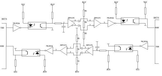 为了增加通信距离,减少通道和电源干扰,可以在通信线路上采用光电隔离的方法,利用RS-422A标准进行双机通信,实用的接口电路如图2所示。