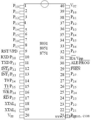 MCS-51是标准的40引脚双列直插式集成电路芯片,引脚排列请参见图。