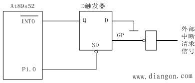 上图中,用D触发器锁存外部中断请求低电平,通过触发器输出端Q送INT0,所以增加的D触发器对外部中断请求没有影响。中断响应后,为了撤销低电平引起的中断请求,可利用D触发器的直接置位端SD来实现。AT89S52的一根I/O口线P1.0控制SD端。只要在SD端输入一个负脉冲(P1.0初始状态为1),即可使D触发器置1,从而撤销了低电平的中断请求信号,所需负脉冲可以通过在中断服务程序中增加以下两条指令得到: