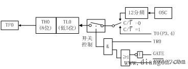 =0时,多路开关接通振荡脉冲的12分频输出,13位计数器以此进行计数,这就是定时工作方式。当C/