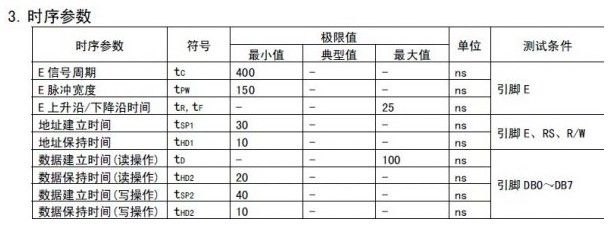 也许你还注意到了上面有许多关于时间的标注,这也是个十分重要的信息,这些时间的标注表明了某些状态所要维持的最短或最长时间。因为器件的工作速度也是有限的,一般都跟不上主控芯片的速度,所以它们直接之间要有时序配合。话说现在各种处理器的主频也是疯狂增长,日后搞不好出现个双核单片机也不一定就是梦话。下面是时序参数表: