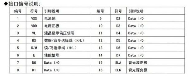 我们首先来看1602的引脚定义,1602的引脚是很整齐的SIP单列直插封装,所以器件手册只给出了引脚的功能数据表: