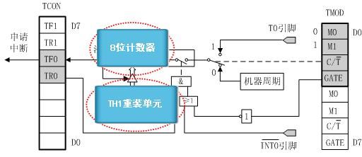 定时器/计数器的实质是加1计数器(16位),由高8位和低8位两个寄存器组成。TMOD是定时器/计数器的工作方式寄存器,确定工作方式和功能;TCON是控制寄存器,控制T0、T1的启动和停止及设置溢出标志。