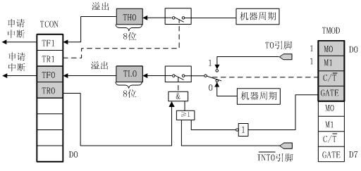 方式0为13位计数,由TL0的低5位(高3位未用)和TH0的8位组成TL0的低5位溢出时向TH0进位,TH0溢出时,置位TCON中的TF0标志,向CPU发出中断请求。