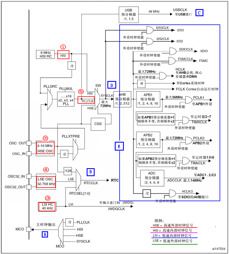 众所周知STM32有5个时钟源HSI、HSE、LSI、LSE、PLL,其实他只有四个,因为从上图中可以看到PLL都是由HSI或HSE提供的。