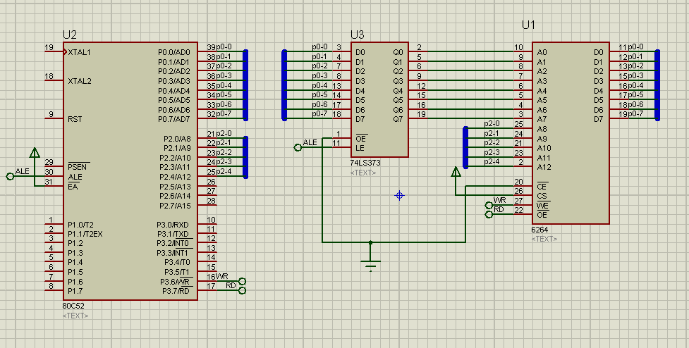 上一文中扩展了单片机的程序存储器,4KB存储空间提升到64KB。其实,4K的代码空间还凑合,但是51自带的256B数据存储空间使用起来还真紧张,其中留给用户的连128B都不到,所以不得不扩展片外RAM。扩展RAM方法和扩展ROM差不多,都是占用P0/P2口做地址线,同时P0用锁存器74373分时复用地址和数据信号。