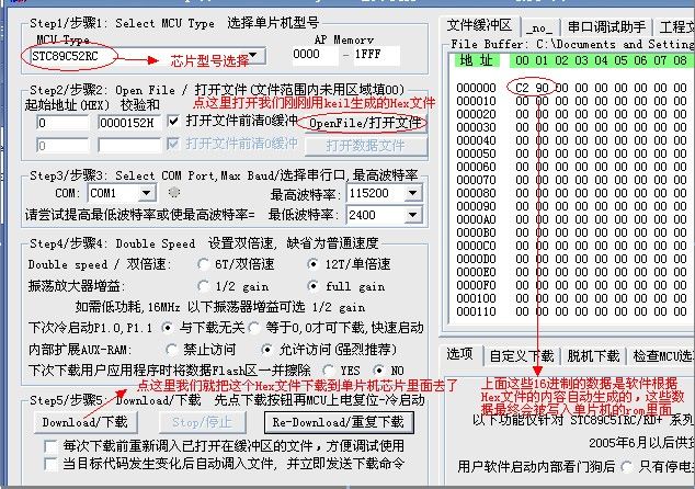 好了…… ,我们把 SETB P1.0 这条汇编语句用keil软件编译生成Hex文件,然后用图3所示的软件和图1所示的硬件(用串口连接电脑)下载到我们已经做好的电路板上的单片机芯片里去(图省事的话建议直接买个开发板),然后接通电源……什么?灯不亮?这就对了,因为我们写进去的指令就是让P10输出高电平,灯当然不亮,要是亮就错了。所以要将keil编缉区的内容改为CLR P1.0,重新编译生成Hex文件,重新下载,接电,好,灯亮了。因为我们写入的Hex就是让P10输出低电平的指令。这样我们看到,硬件电路的连线没有做任何改变,只要改变写入单片机中的内容,就能改变电路的输出效果。
