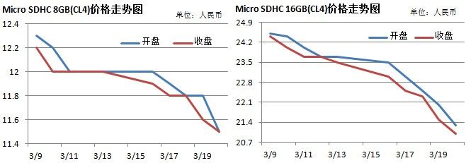 数据:2015年3月24日价格更新至于闪存卡产品,大陆春节假期过后,市场需求复苏迟缓,3月的市场需求依然疲软,导致闪存卡价格持续微跌。据中国闪存市场网(0309-0320)报价显示,闪存卡Micro SD(CL4)8GB价格由12.3元下跌至11.5元,下滑6.5%;16GB价格由24.5元下跌至21元,下滑14.3%;32GB价格由48元下跌至44.5元,价格下滑7%。低容量2GB和4GB价格均下滑5%。