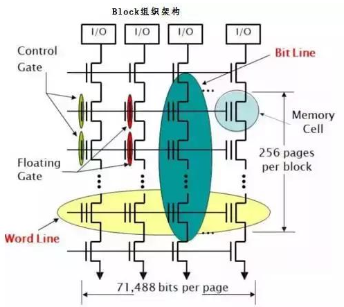 下图是一个FLASH Block的组织架构,每个Cell的漏极对应BL(Bitline),栅极对应WL(Wordline),源极都连在一起。每个Page对应着一个Wordline,通过Wordline加不同电压和不同时间长度进行各种操作。