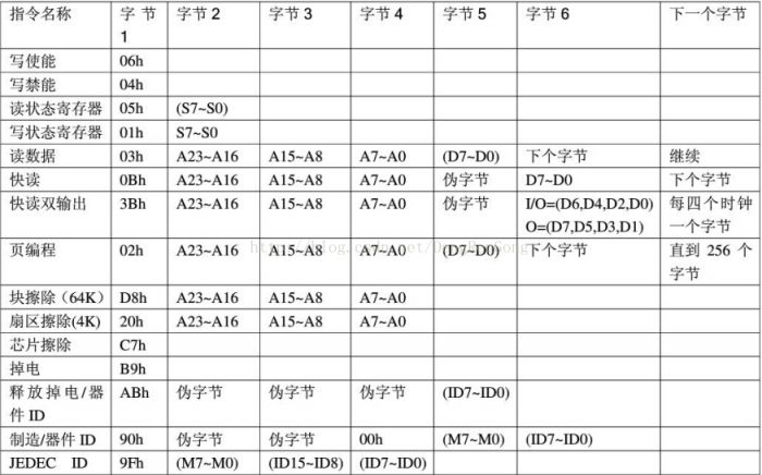 - 对W25X64的写入读出都伴随着指令,指令集如下