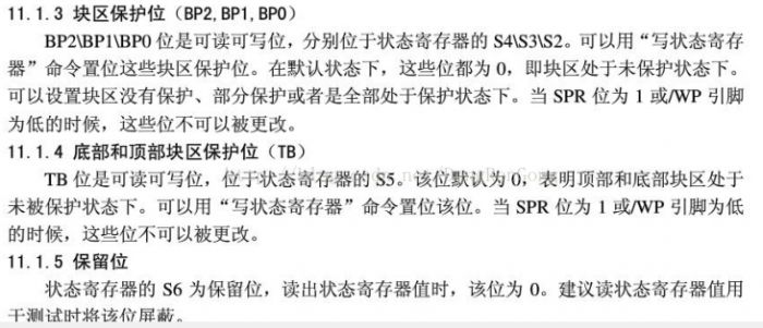 wel:写保护位,只读,当芯片处于写保护状态的时候,该位为0,所以当要对芯片进行操作的时候一定要查看这一位,否则无法写入,该位在掉电后,写禁能,页编程,扇区擦除,芯片擦除以及写状态寄存器特定值之后会变为0,执行写使能命令之后会变成1
