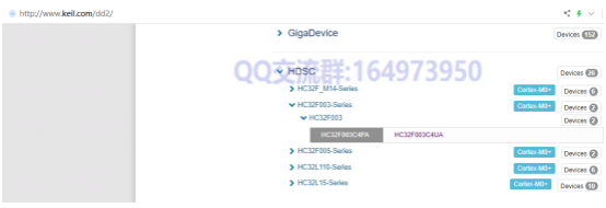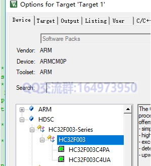 可以看到只有ARM这一个选项,里面没有华大单片机的HDSC选项。下面就以HC32F003为例介绍如何设置,将华大单片机的相应型号加入其中。