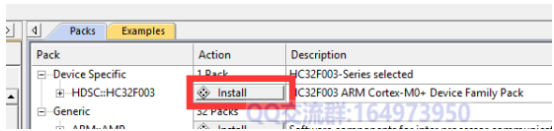 在窗口的右侧会看到Device Specific项中HDSC::HC32F003后面出现Install按键,单击就会自动从网上下载其支持包并进行安装。