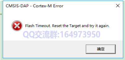 在使用MDK进行开发的时候程序编译没有问题,点击下载或仿真的时候跳出个对话框提示Flash Timeout.Reset the Target and try it again,如下图所示: