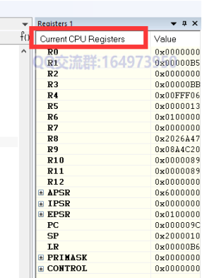 在界面的右侧会看到打开的Register x的观察窗口。在窗口中只有Current CPU Registers,下面只列出了通用的寄存器,没有我们想要的外设的特殊功能寄存器,在Current CPU Registers上单击鼠标右键。