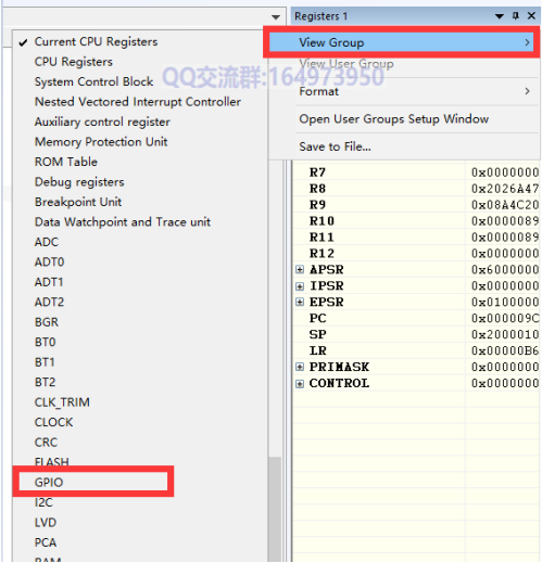 单击右键后会看到View Group,把鼠标移动到View Group上会看到弹出的外设特殊功能寄存器选项,选中GPIO,如下图: