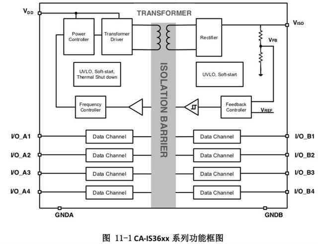 2.CA-IS36xx系列产品集成了高效率、低辐射的隔离型DC-DC转换器,并具有高速隔离数据通道。CA-IS36xx系列产品 的功能框图如图11-1所示。