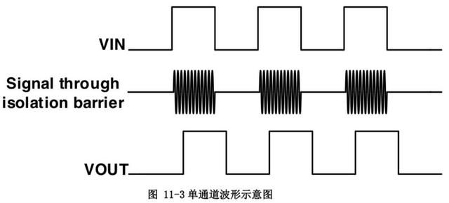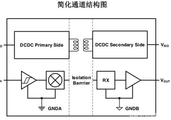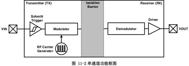 高速隔离数据通道使用简单的开关键控(OOK)调制解调方案。由SiO2构成的高压隔离电容为不同的电压域之间提供 可靠的绝缘屏障,并提供可靠的高频信号传输路径;为了保证稳定的数据传输质量。发射机(TX)将输入信号调制到载 波频率上,即TX在一个输入状态下通过隔离电容传递高频信号,而在另一个输入状态下无信号通过隔离电容,然后接 收机根据检测到的带内数据重建输入信号。这个架构为隔离的不同电压域之间提供了可靠的数据传输路径,在启动时 不需要考虑初始化。全差分的隔离电容架构可以最大限度地提高信号共模瞬态抗干扰能力。与电感耦合结构相比,电 容耦合结构提供了更高的电磁抗扰性。图?11-2?和图?11-3?分别为单通道功能框图和调制方案的波形示意图。