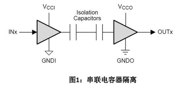 川土隔离器使用二氧化硅(SiO2)作为信号绝缘和数字隔离器中使用的电介质。通常使用两个串联的二氧化硅电容器,即在隔离栅的每侧各一个,从而实现高压隔离,等效隔离图示如图1所示。与基于电感的(磁隔)隔离器和传统的光耦相比,SiO2所提供的介电强度是最高的,不会因暴露于环境湿度而退化,并且可以有大于100年的隔离寿命。为了更深一层关于川土隔离技术的说明,请参阅使高压信号隔离质量和可靠性。