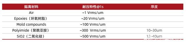 下图的表格可以看到,聚酰亚胺特性大约是300伏每微米,二氧化硅的耐压大约是500伏每微米。同时由于PI也就是聚酰亚胺的制作工艺难度,一般只能做到20um左右,技术较高的话可以做到30um。