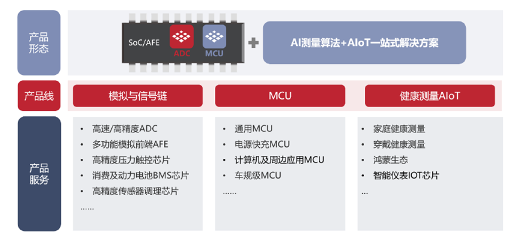 公司产品主要包括MCU芯片、模拟信号链芯片、健康测量与AIOT等三大产品线,广泛应用于工业测量与工业控制、通信与计算机、锂电管理、消费电子、汽车电子、智慧家居、智能仪表、智慧健康等领域。