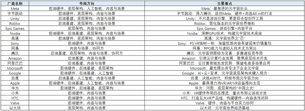 随着Facebook更名为Meta,各大厂商也陆续宣布正式进军元宇宙。海外由Meta引领,微软、苹果、谷歌等相继入局。国内各互联网大厂也不甘落后,腾讯、字节跳动、百度、阿里也纷纷开始布局元宇宙。目前各大厂商的布局模式主要以收购+结合自身产品为主。游戏行业,以腾讯、网易为主导;社交软件行业,字节跳动占得先机;而百度、阿里则更多的是在云计算、VR方向布局元宇宙。