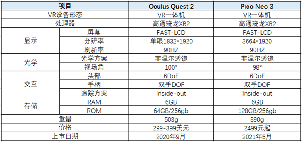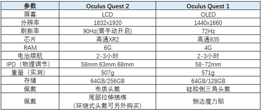 Oculus Quest 2与Oculus Quest 1技术参数比较