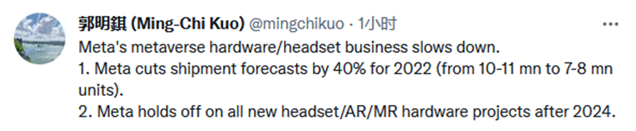 此前,天风国际分析师郭明錤就曾透露,中国主要安卓手机品牌今年迄今已削减约1.7 亿部订单,约占原2022年全球出货计划的20%。近日,郭明錤又在推特上表示,Meta将2022年元宇宙硬件的出货量预测削减了40%,从原来的1000万-1100万台降至700万-800万台。