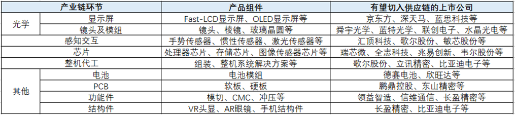 当中,以布局VR/AR产业前沿技术、进入全球VR/AR品牌厂商供应链的国内上市公司更值得关注。包括提供整机解决方案的歌尔股份,提供显示屏的京东方,提供 CIS 芯片的韦尔股份,提供光学组件或模组的舜宇光学科技、蓝特光学、联创电子,以及提供PCB的鹏鼎控股、东山精密等。