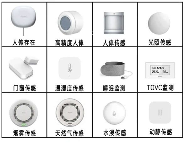 第一类是环境类传感器,像温湿度传感器,TVOC传感器,它们可以感知环境中的温湿度,空气中的有害物质,然后就可以联动家里面的空调,加湿器,空气净化器这些设备,给大家一个健康又舒适的居住环境。