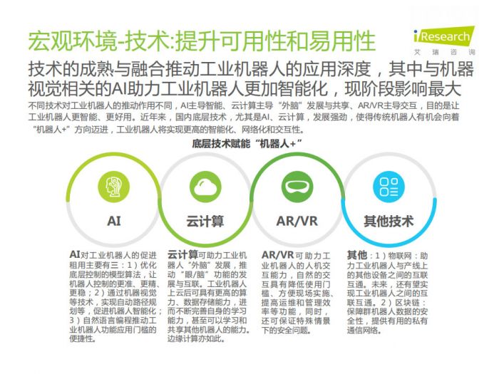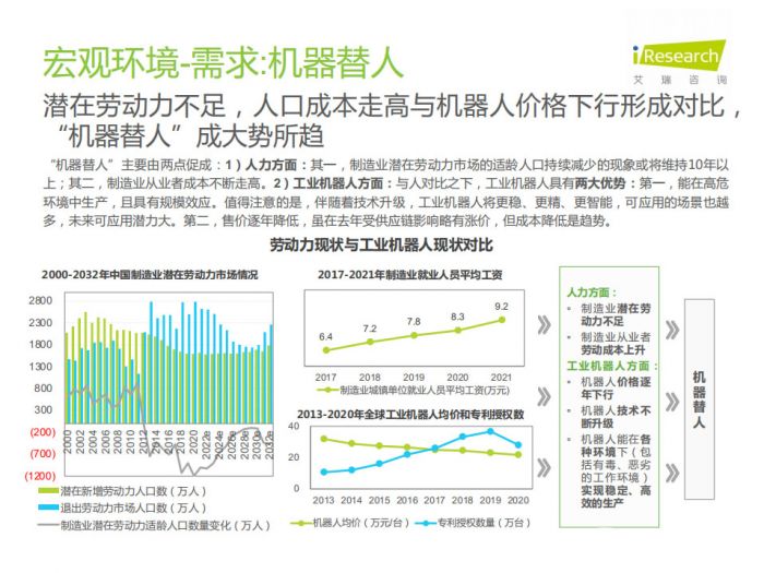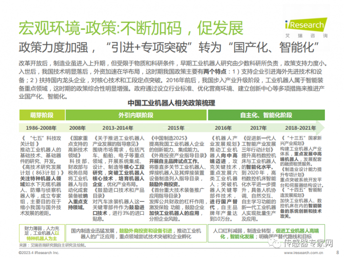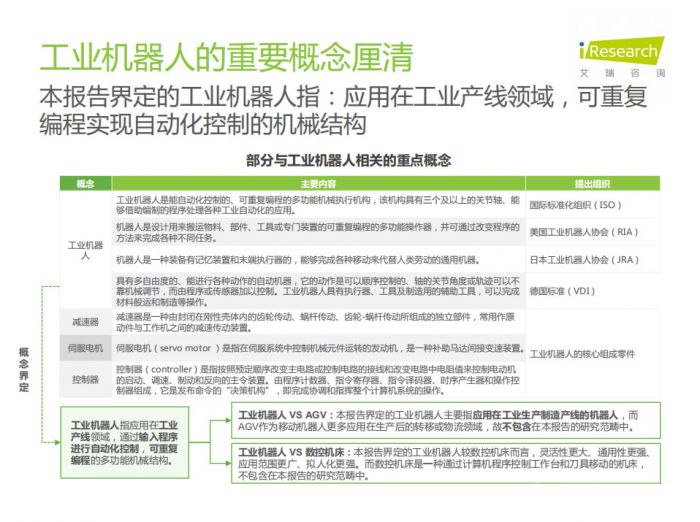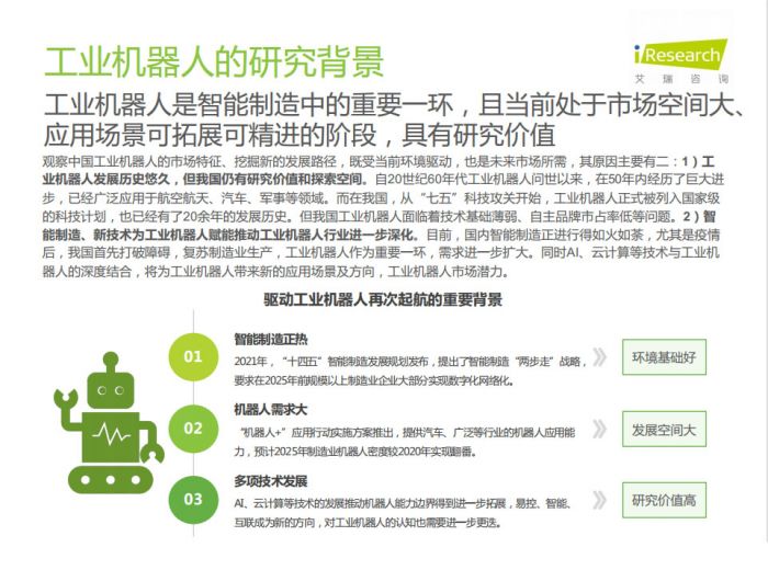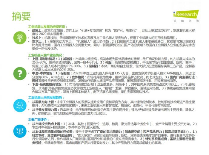 报告将立足于中国工业产业升级和智能制造的大背景,通过对供应端市场和产业链的剖析,结合投资视角,探讨工业机器人企业如何打造自身竞争力,赋能中国工业产业,给企业带来新的增长与转型机会,由此思考中国工业机器人行业的现状与未来趋势。报告还将展示行业市场规模及公司价值图谱,展现行业代表厂商的服务能力,共创中国工业机器人行业新篇章。报告分为五个部分。①通过明晰工业机器人定义,梳理中国工业机器人行业的发展背景和发展历程,以此阐述中国工业机器人发展的迫切性、必要性及价值所在;②从市场宏观的角度,剖析中国工业机器人发展的驱动因素,并进行解读;③结合产业链视角,对中国工业机器人整体产业链情况,包括上游零部件、中游本体、下游集成的相关企业的现状、特征、技术、痛难点、优势等方面进行研究分析,体现上游重技术、中游重产品、下游重行业和场景的特征,帮助供给侧企业更好地把握市场新的动向,做出更优的战略调整;④基于以上内容,展开对工业机器人未来发展趋势的研判分析;5)通过对中国工业机器人资本市场的研究,以及公司价值矩阵的评选,体现本体和集成行业现有的优势企业,为工业机器人赛道的投资者提供一定的专业视角和策略建议。