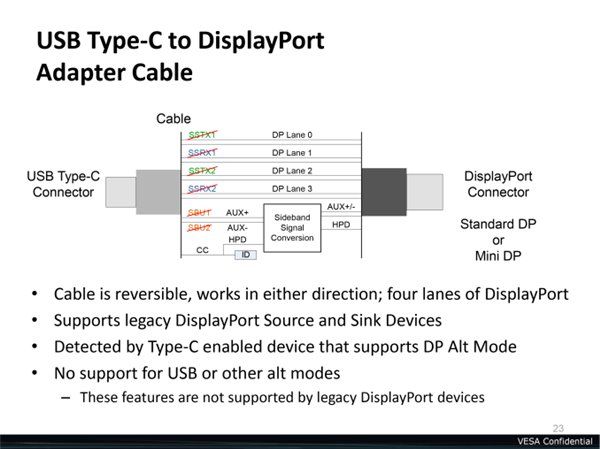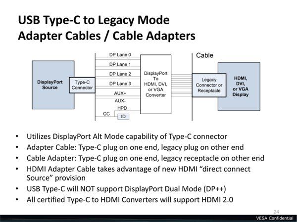 DP交替模式让未来的转接线和转接器变得更加统一,像是VGA、DVI以及未来的HDMI 2.0也都可以通过USB Type-C转接而来。不过要注意的是,这一模式暂时还不支持双模式DP接口(DP++),而目前各种被动式DP转接头/线都是基于双模式DP接口设计,它会根据不同的转换信号切换供电状态而无需外接供电,也就是说支持DP交替模式的USB Type-C转接器都需要主动供电。