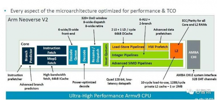 重要的是,V2是基于新的Armv9指令集的实现,旨在颠覆该架构,与十多年来定义Arm芯片的许多代Armv8架构相比,它带来了性能、安全性和可扩展性的增强。