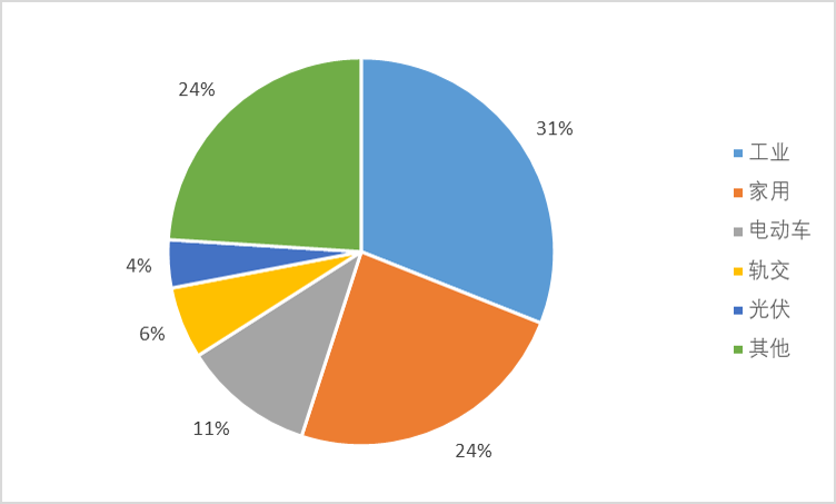 根据 Yole 数据, 2020 年工业、家用、电动车、轨交、光伏、其他行业市场规模占比为 31%、 24%、 9%、 6%、 4%。
