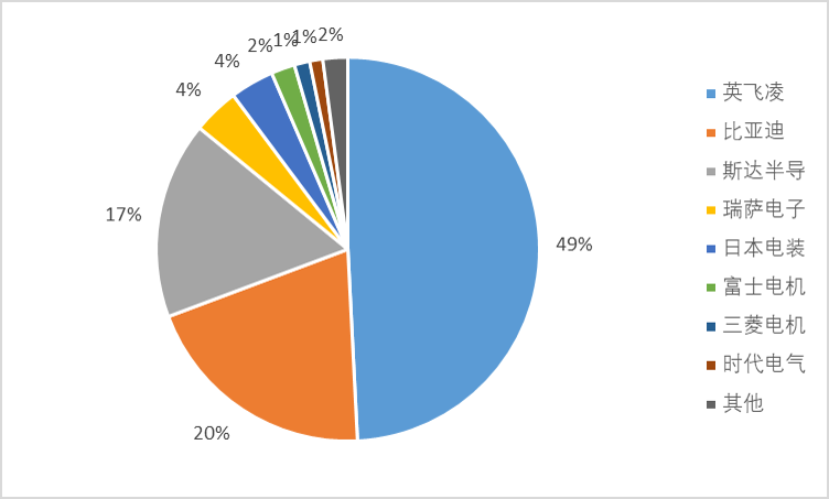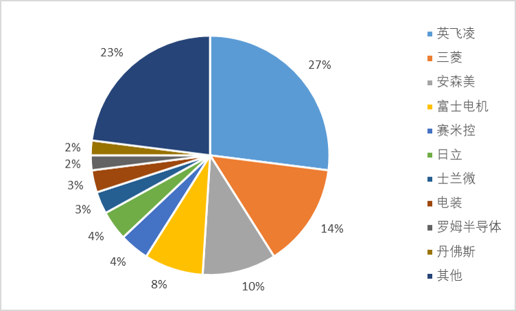 从全球 IGBT 竞争格局来看,行业较为集中, 根据 Yole, 2020 年行业 CR3达 50%,英飞凌是行业绝对龙头、市占率达 27%。