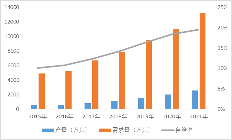 根据 Yole,从产量来看, 2015 年国内自给率为 10%、 2021 年国内自给率仅19%, 行业自给率缓慢提升。考虑海外产品规格更高、预计从市场规模口径来看国产化率更低。